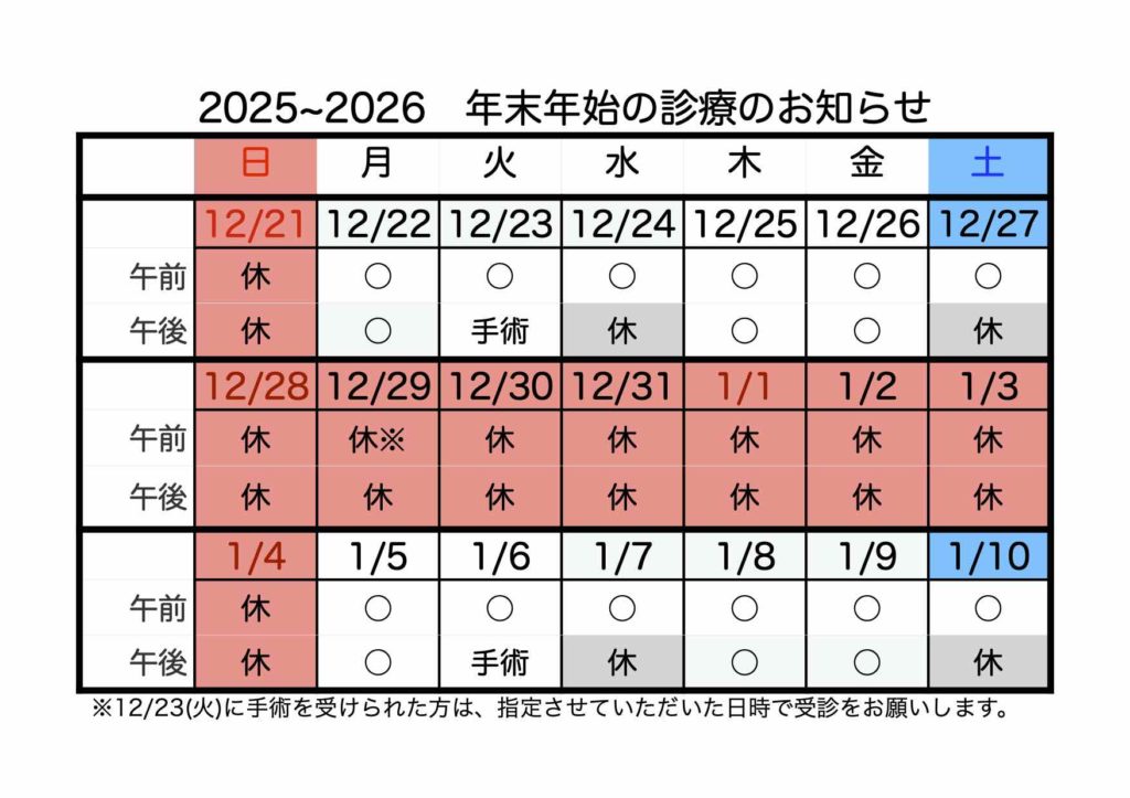 年末年始(2025年12月〜2026年1月)の診療に関しまして